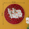 This beautiful pichwai painting features a curious cow holding a lotus flower, a symbol of purity in Hinduism. The painting is hand-painted on a red background and is sure to add a touch of whimsy and cultural significance to any home.